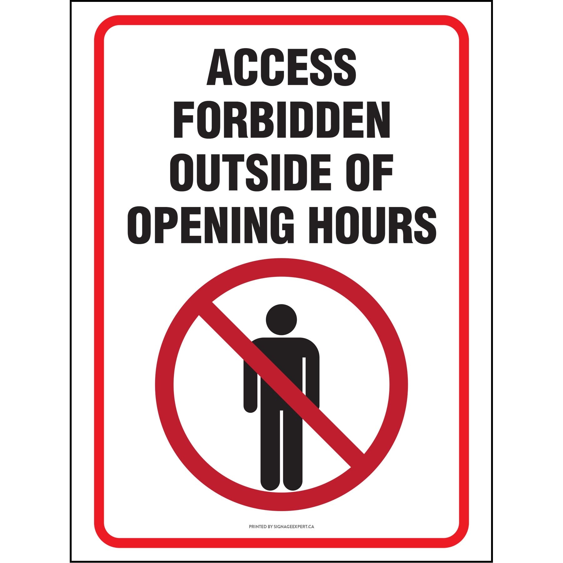 This Access Forbidden Outside of Opening Hours sign serves as a notice to the public of access to the given location outside of regular hours and makes clear that access is prohibited.