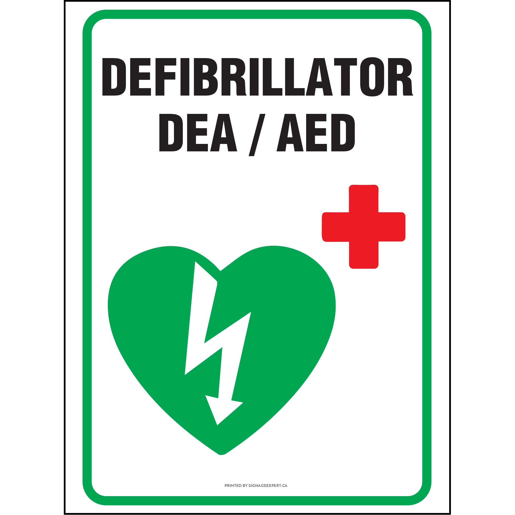 The sign is best displayed outside of buildings to notify the presence of defibrillator inside, at the entryway to various buildings and areas and above or right next to where the defibrillator is kept.