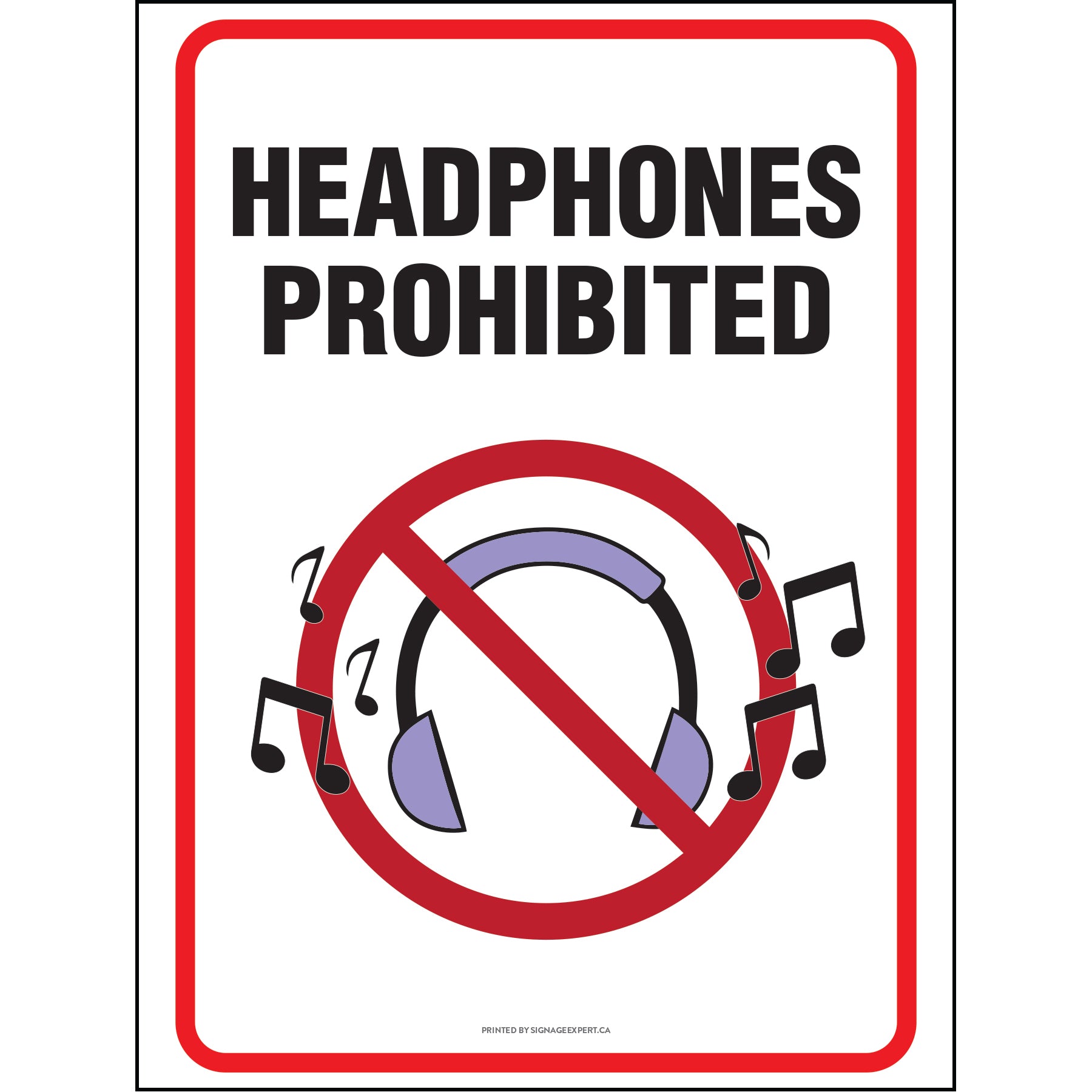 The "Headphones Prohibited" sign ensures health and safety in the workplace by reminding employees and individuals that wearing headphones or listening to music while engaging in the given activity or being in the given area can pose a health and safety risk. If being able to hear is an essential part of the job, then it is imperative that individuals are alert and reading to listen for instructions or information.