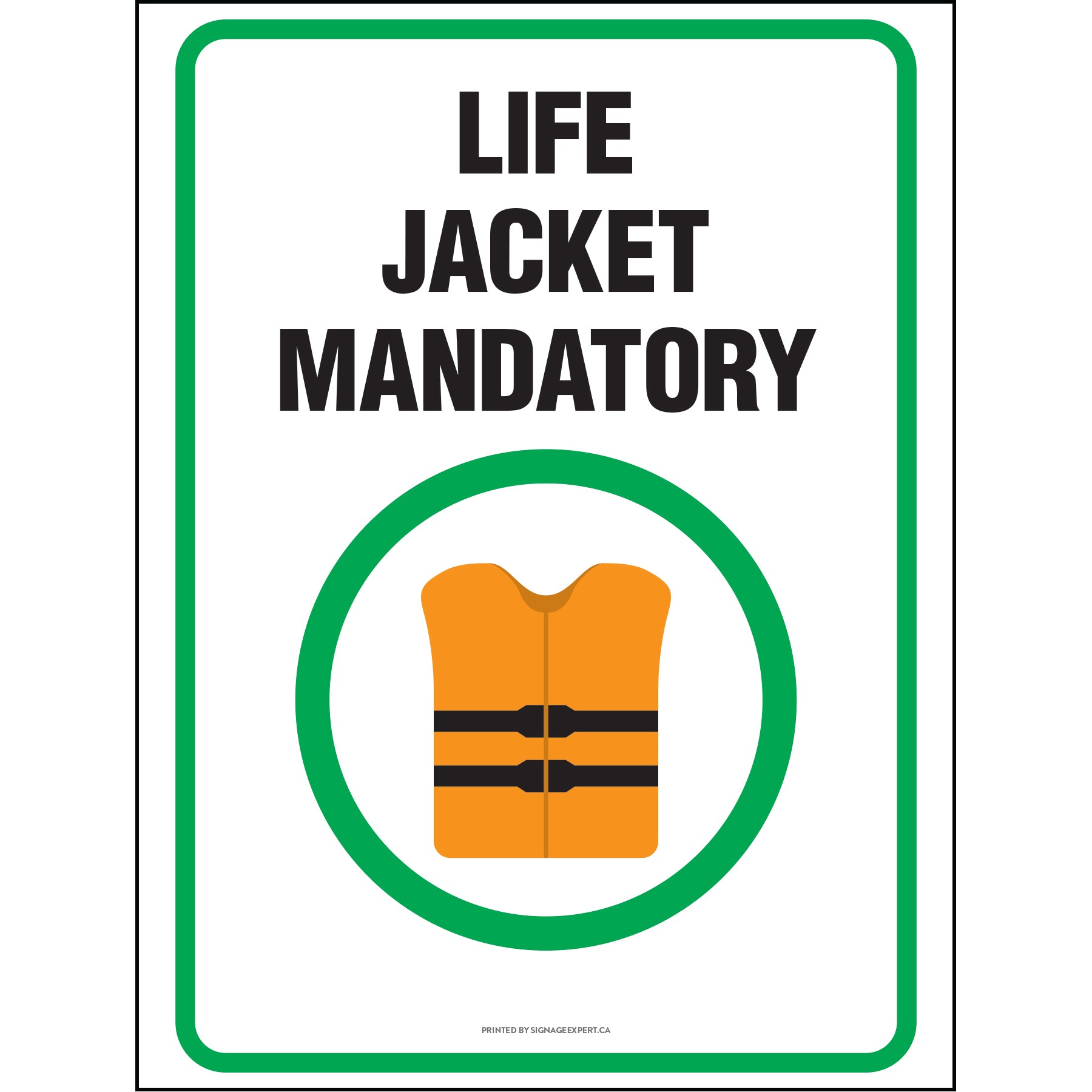 The "Life Jacket Mandatory" sign reminds individuals of equipment requirements and the health and safety guidelines of certain areas and bodies of water. It asks for the use of lifejackets, or any other personal flotation devices, PFDs, to be on a persons when in the given environment. Pictured on the sign is an example of a lifejacket to give a visual representation of what is expected of individuals.