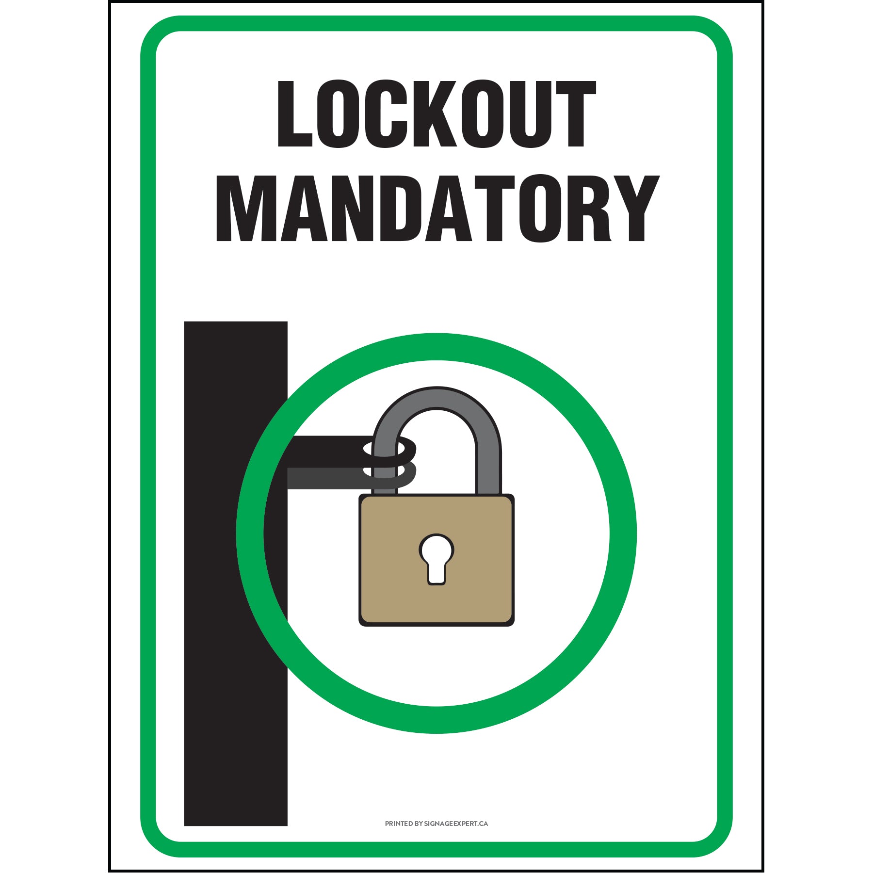 The "Lockout Mandatory" sign ensures health and safety of employees and individuals in the workplace by establishing the required presence of a locking system to control energy from given machinery, equipment or process. It draws attention to the associated risks with the given action and ensures that the appropriate reaction to given energy emergencies is handled accordingly.