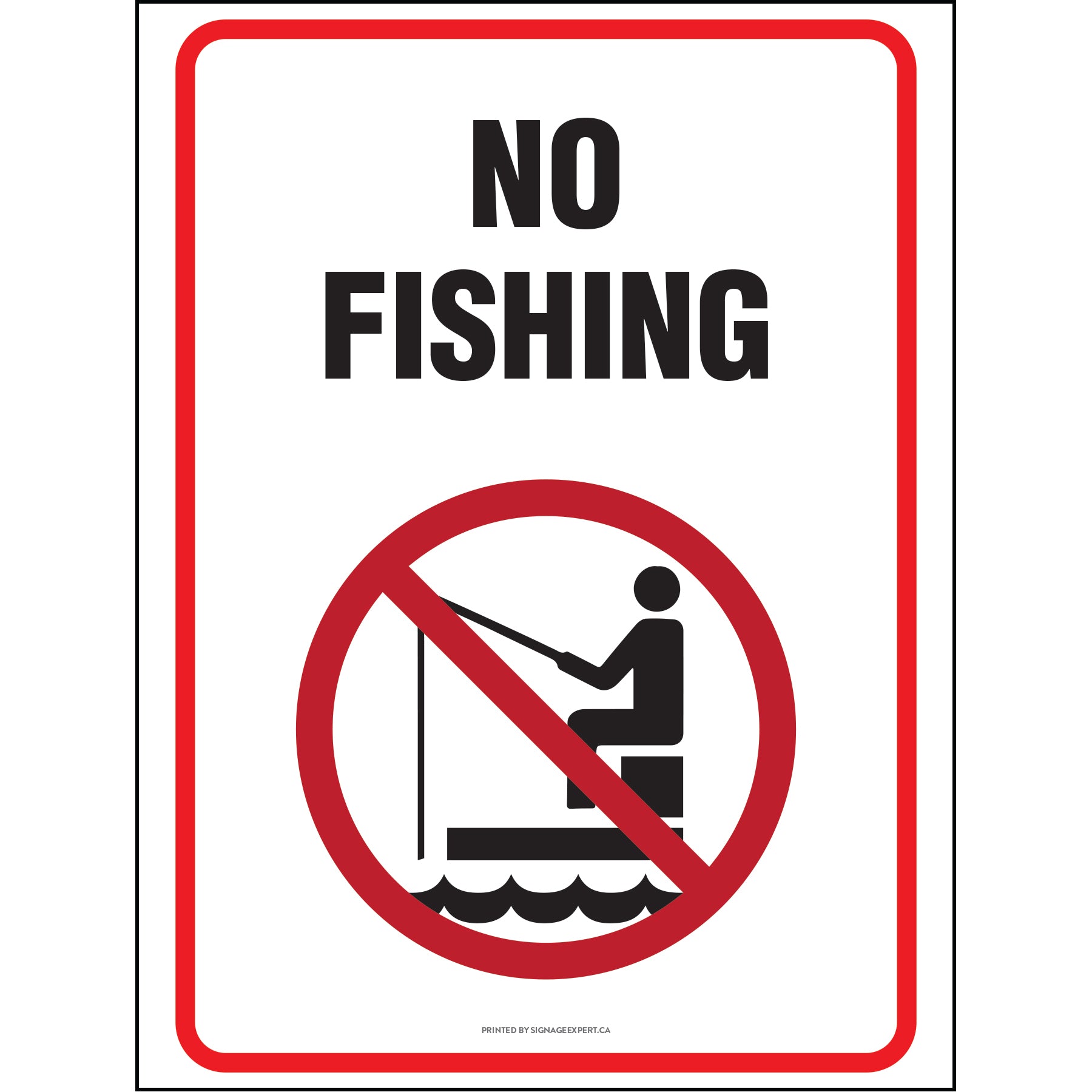 The "No Fishing Allowed" sign notifies the public that the act of fishing in the given private pr public body of water is not allowed. Whether for reasons of health and safety, trespassing or conservation, the sign tells the individual to refrain from engaging in the act. The sign pictures a barred person fishing to provide visual representation of the unwanted behaviour.