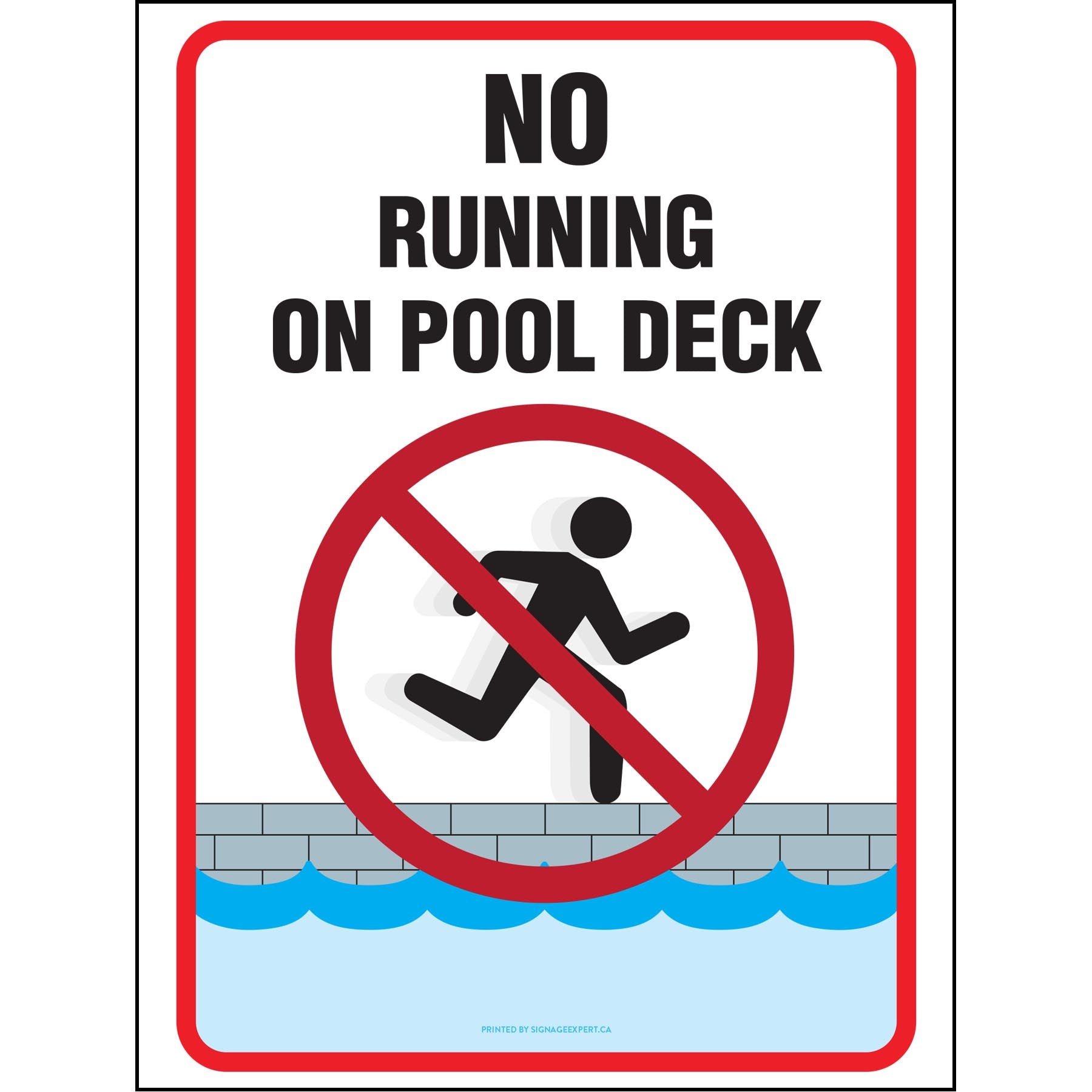 This No Running on Pool Deck sign is a health and safety notice to the public at any pool or aquatics facility. It reminds patrons to follow the health and safety guidelines of the given facility and not engage in dangerous behaviours.