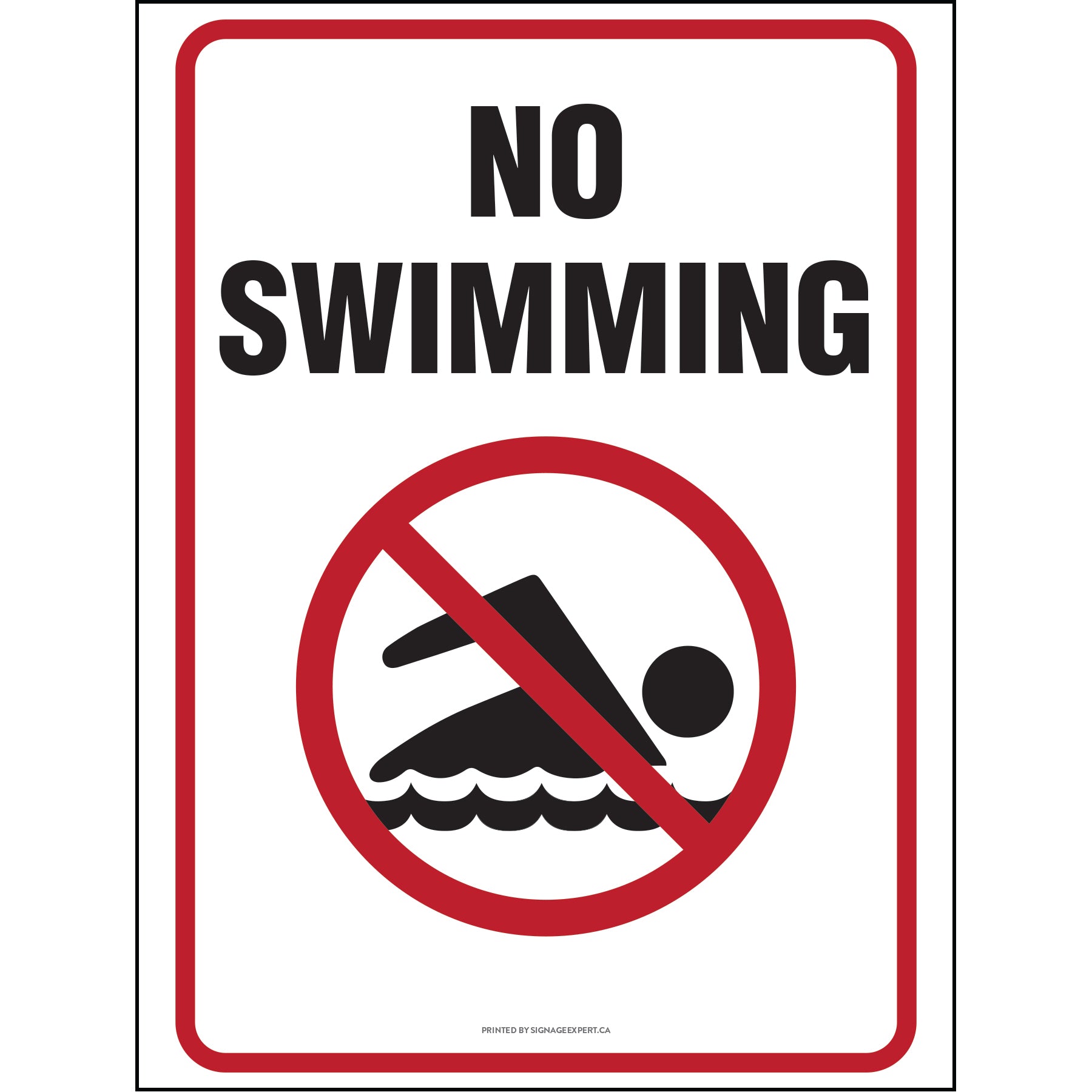 The "No Swimming" sign notifies the public of the health and safety measures in the given pool or body of water that prohibit swimming in the water. Whether it is due to water contaminants, conditions, lack of supervision or any other reasoning, the sign notifies people that they are not allowed to enter into the water.