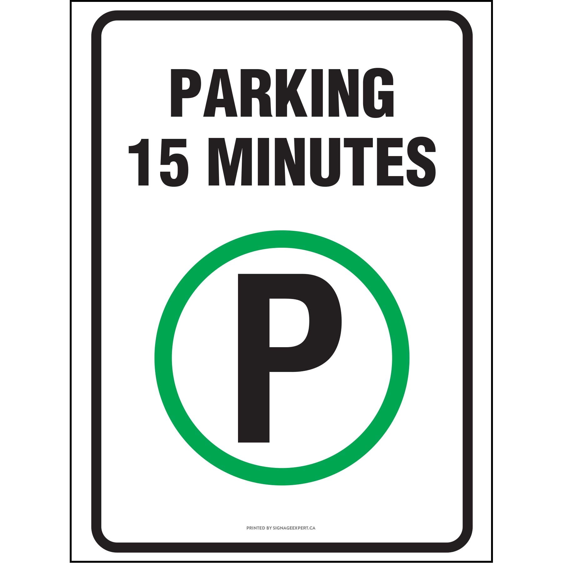 The "Parking 15 minutes" sign is a traffic sign that notifies the individual that it is prohibited to park in the given area for over 15 minutes. The sign only displays the parking "P" in a green circle, showing that parking is allowed given that it follows the rules set in place on the sign.