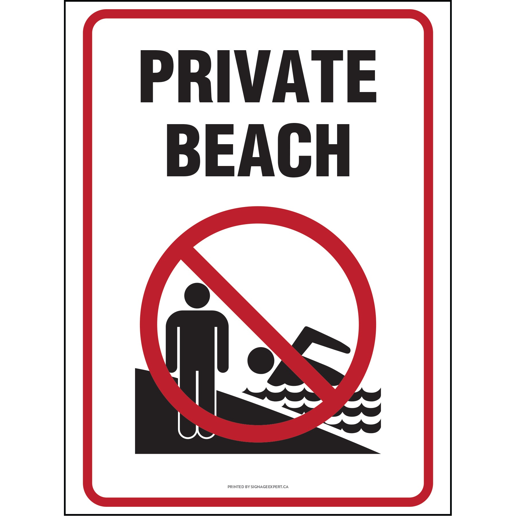 The "Private Beach" sign notifies individuals of privately owned beach or waterfront property that cannot be crossed or used. The sign shows an individual swimming and another individual standing on the shore both crossed off, warning individuals to not engage in any activities on the private beach.