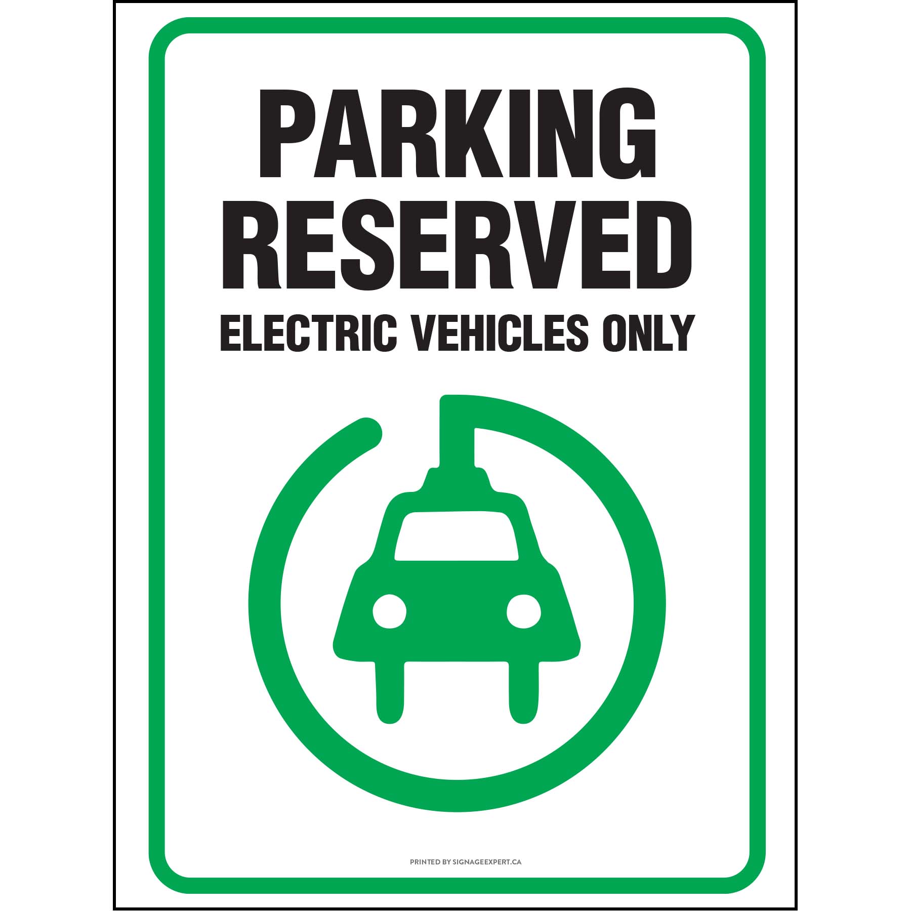 The "Reserved Parking - Electric Vehicle" sign is a traffic sign that notifies the individual that it is prohibited to park in the given area unless it is an electric vehicle. The sign only displays the parking "P" in a green circle, showing that parking is allowed given that it follows the rules set in place on the sign.