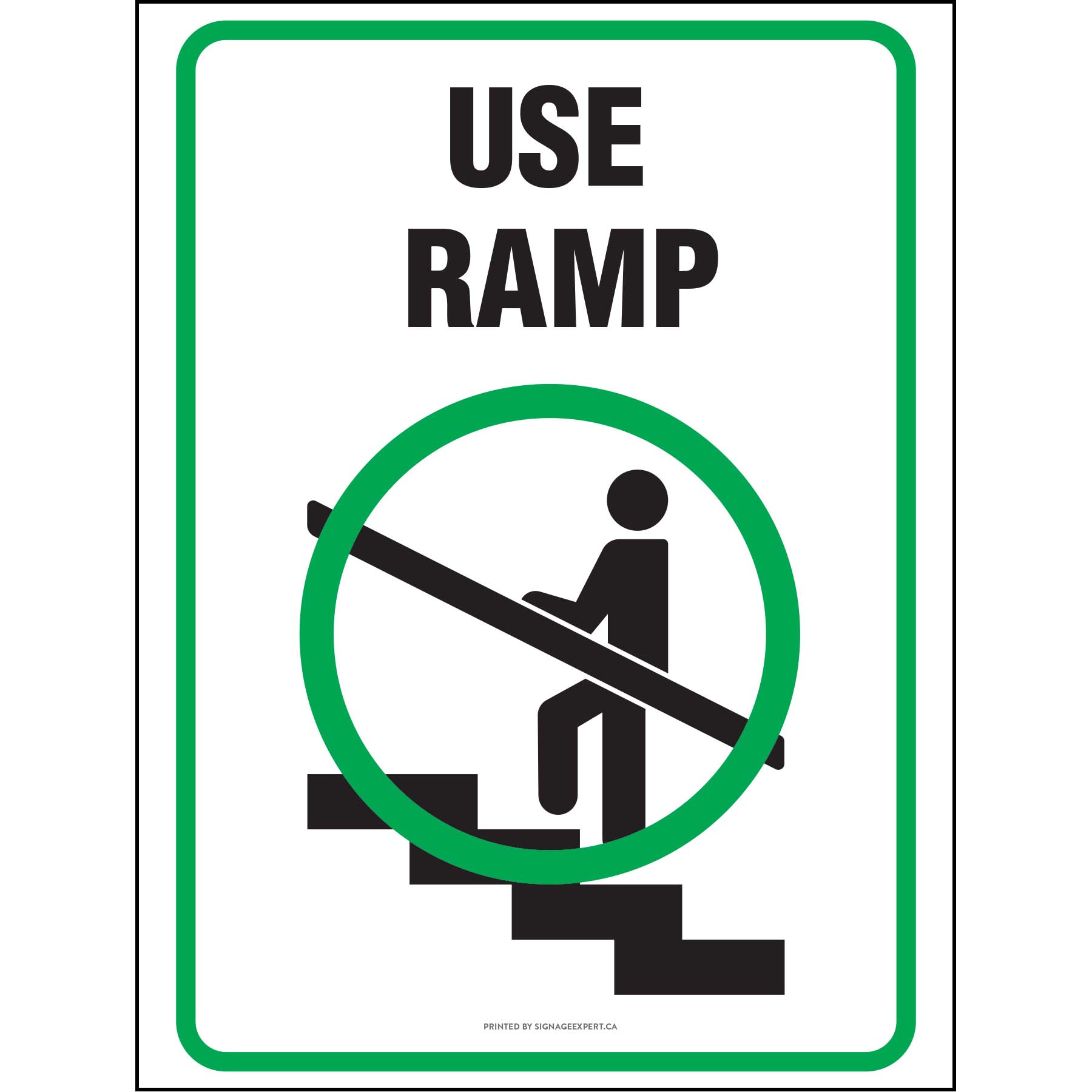 The "Use Ramp" sign shows the appropriate behaviour in the given space or workplace to move around the given area by using the ramp. Whether for accessibility or general health and safety, it tells an individual what is expected of them in the given environment.