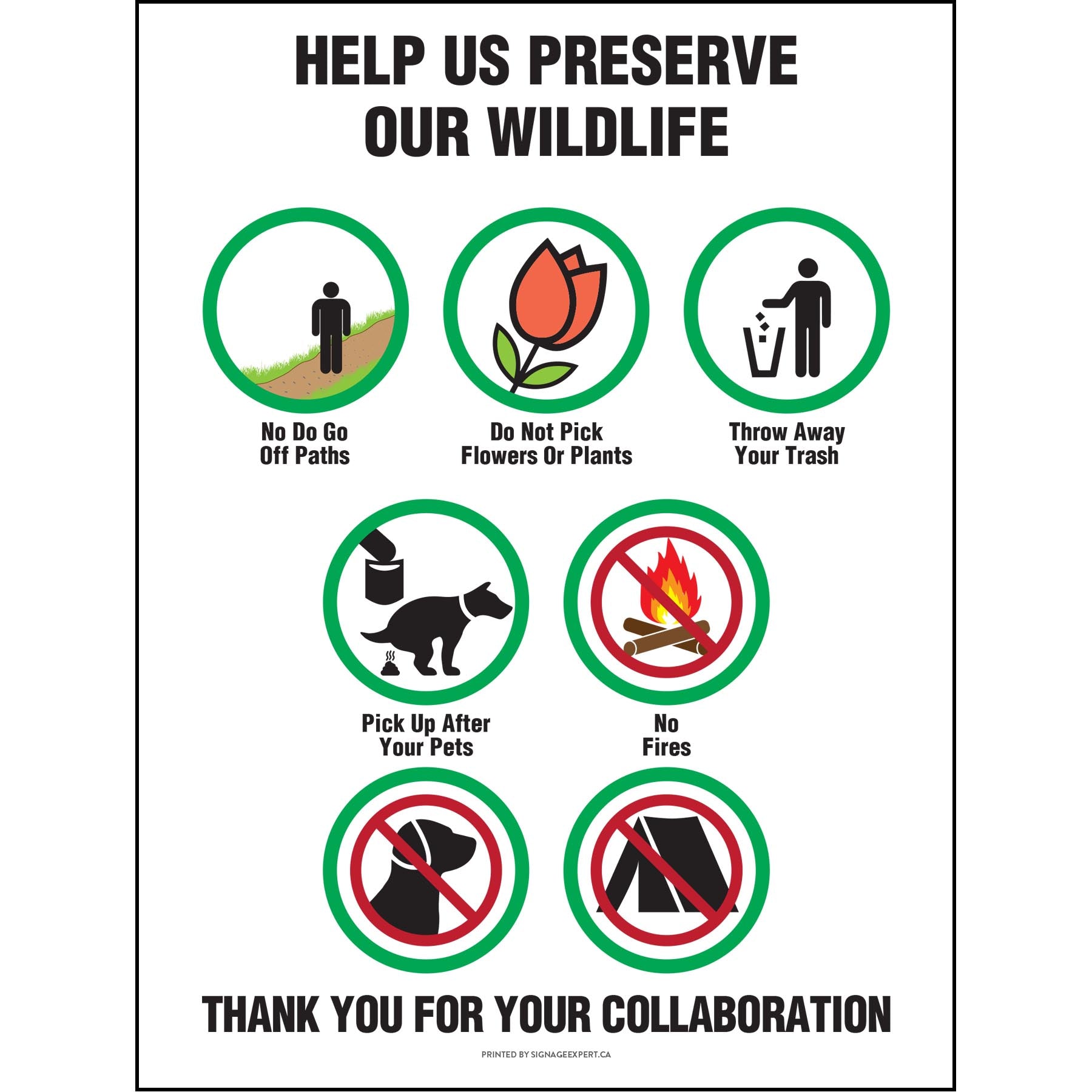 This Walking Path - Preserving Wildlife sign is a notice to the public of proper etiquette in the given area. It illustrates the appropriate measures to take to preserve and conserve the surrounding environment.