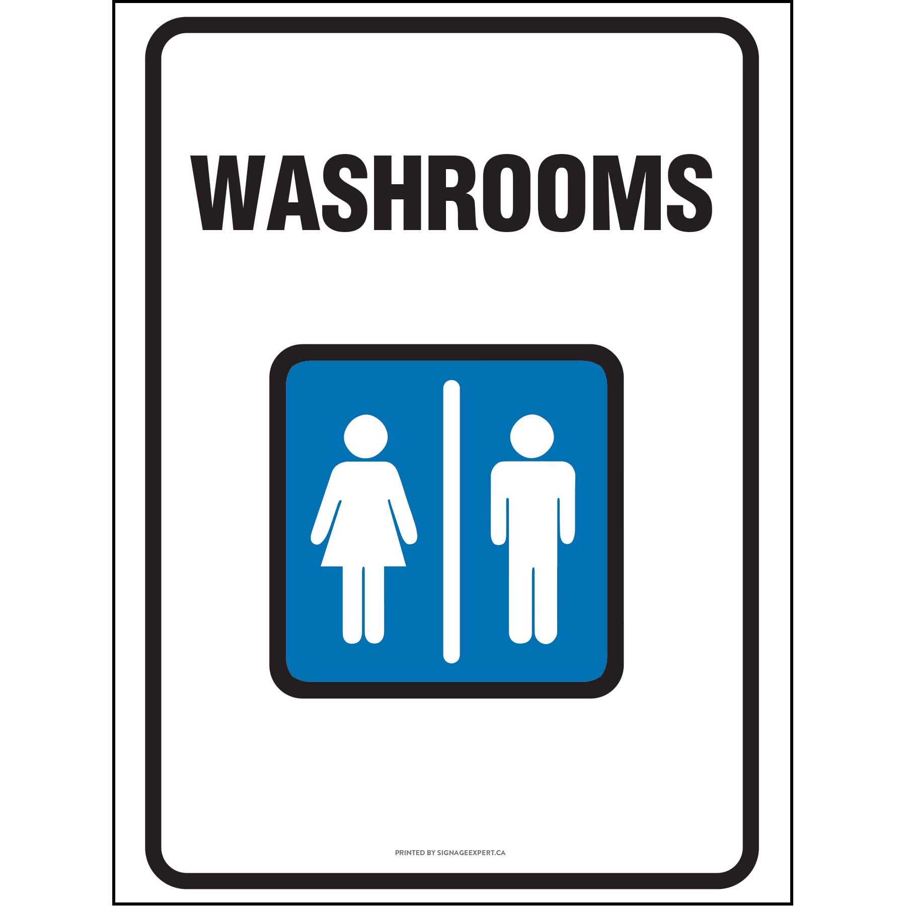 The "Washrooms" sign identifies the presence of washrooms in the workplace, commercial space or building. The sign displays the universal sign for washrooms and the word "washrooms" for fast recognition.
