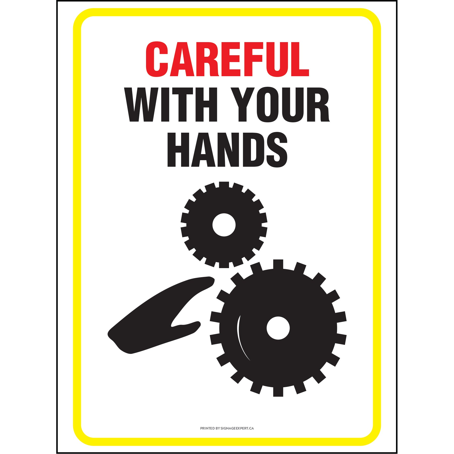 The "Careful With Your Hands" sign is used for ensuring health and safety in the workplace by reminding employees and individuals to remain cautious while manipulating certain equipment and machinery and while moving around in the given environment. Pictured on the sign is a hand reaching in between two ridged gears, showing the individual the risks associated with the lack of proper awareness to workplace dangers.