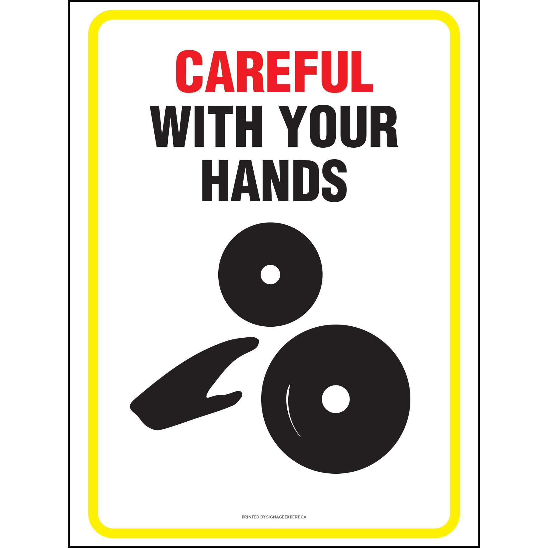 The "Careful With Your Hands" sign is used for ensuring health and safety in the workplace by reminding employees and individuals to remain cautious while manipulating certain equipment and machinery and while moving around in the given environment. Pictured on the sign is a hand reaching in between two smooth gears, showing the individual the risks associated with the lack of proper awareness to workplace dangers.